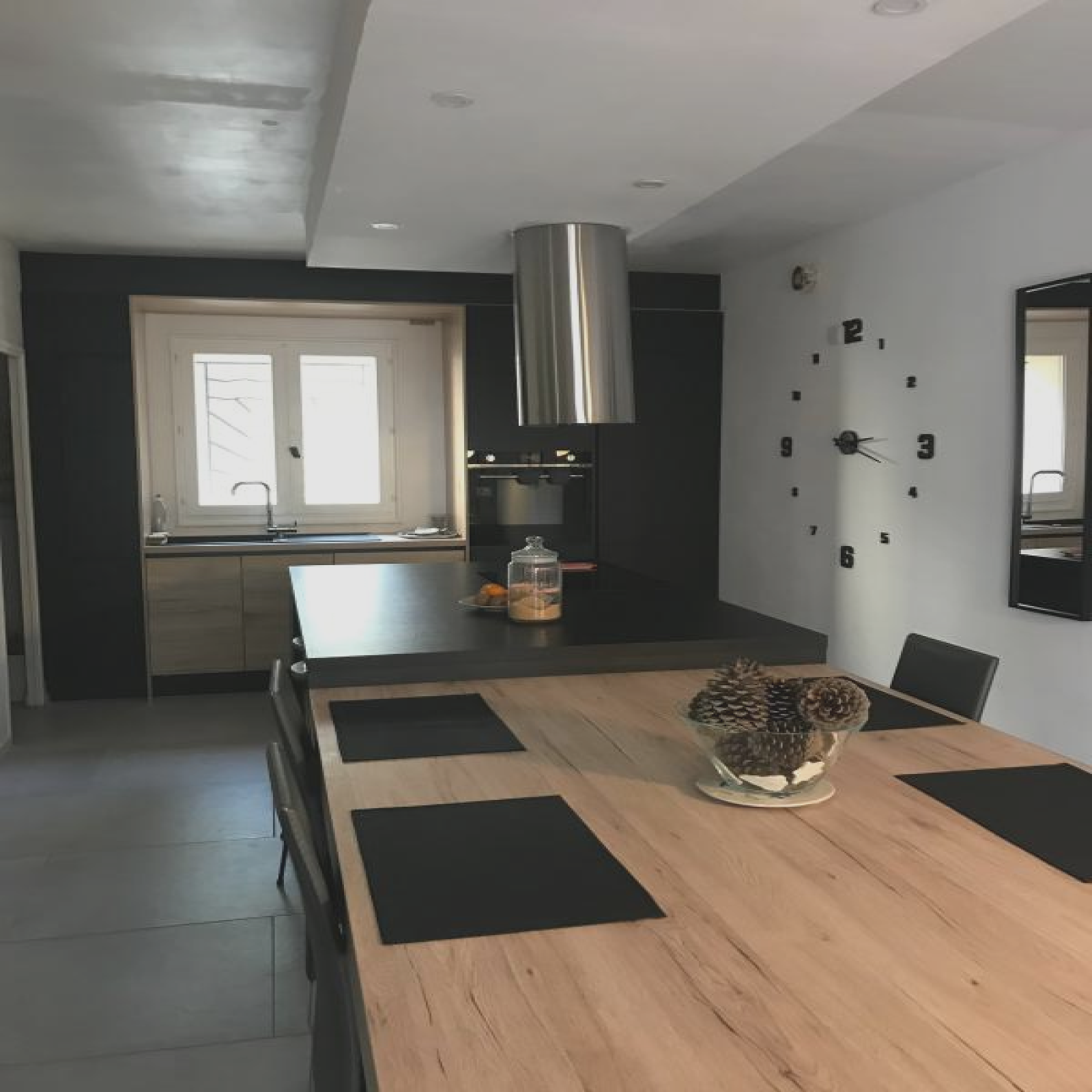 Au Rez-de-chaussée, un salon séjour avec une cuisine ouverte et complètement équipée, un cellier, une salle d'eau et un wc.