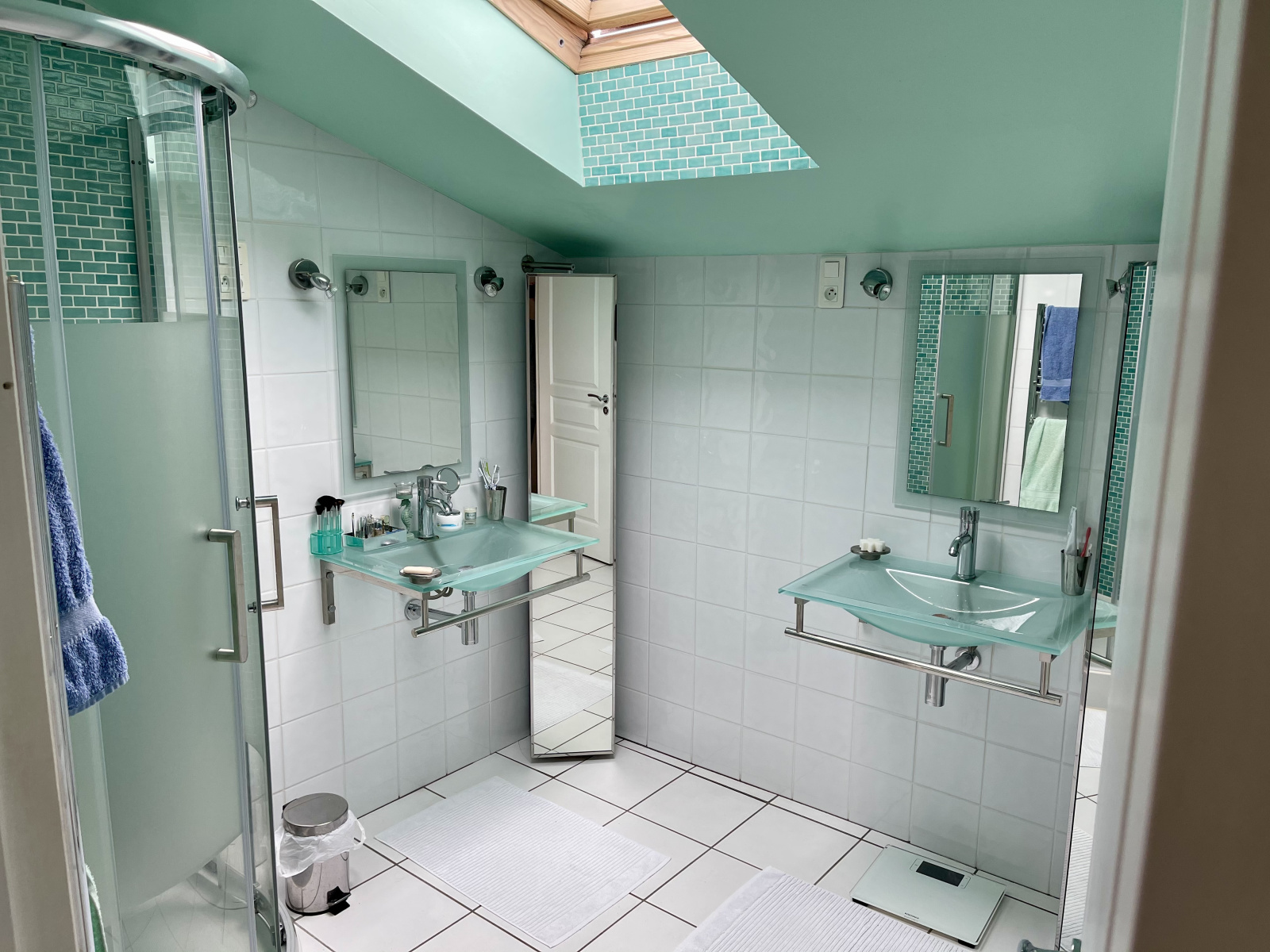 À l'étage on retrouve deux belles chambres, 17 et 13m², un dressing, une grande salle d'eau et un Wc.