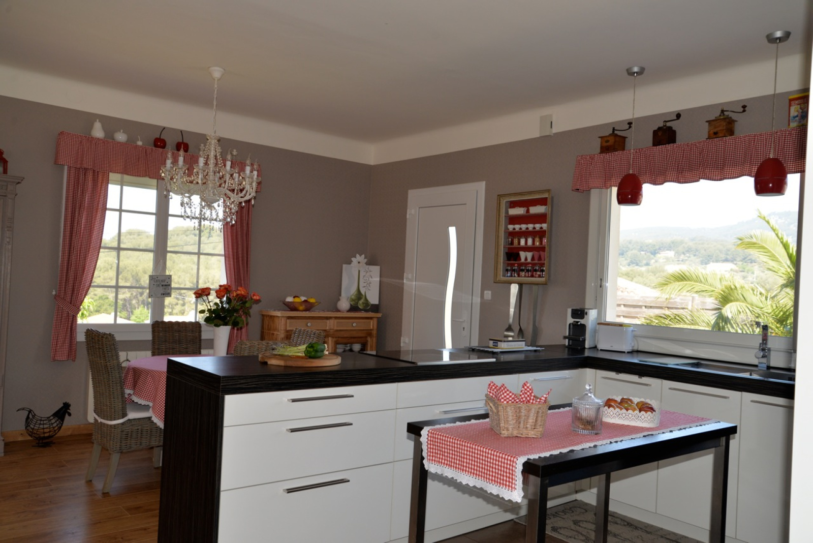 Une grande cuisine parfaitement aménagée lumineuse avec vue sur le jardin.