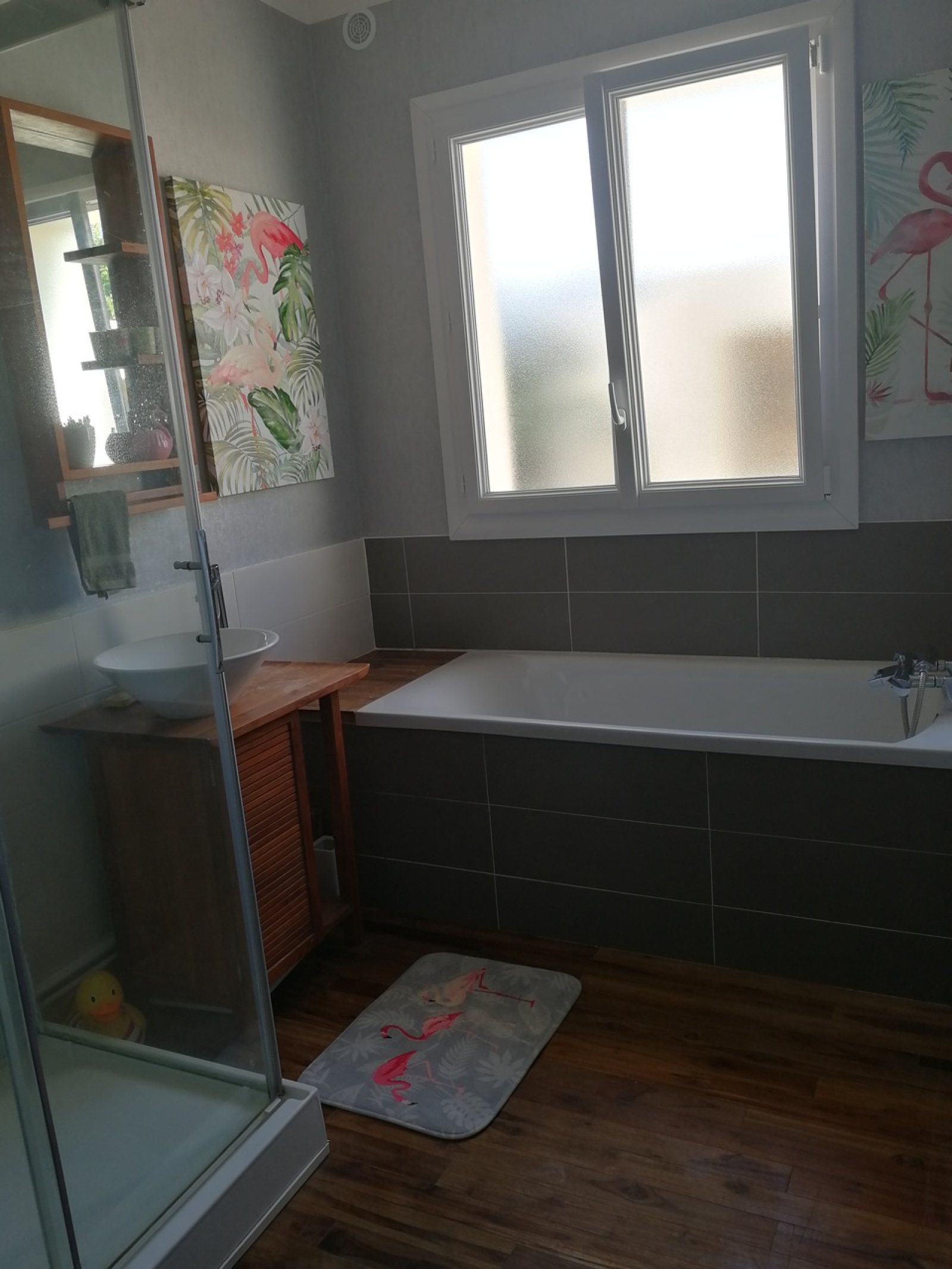 Un espace nuit avec 2 chambres dont une de19m². Une salle d'eau avec douche et baignoire, un Wc séparé.