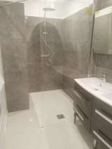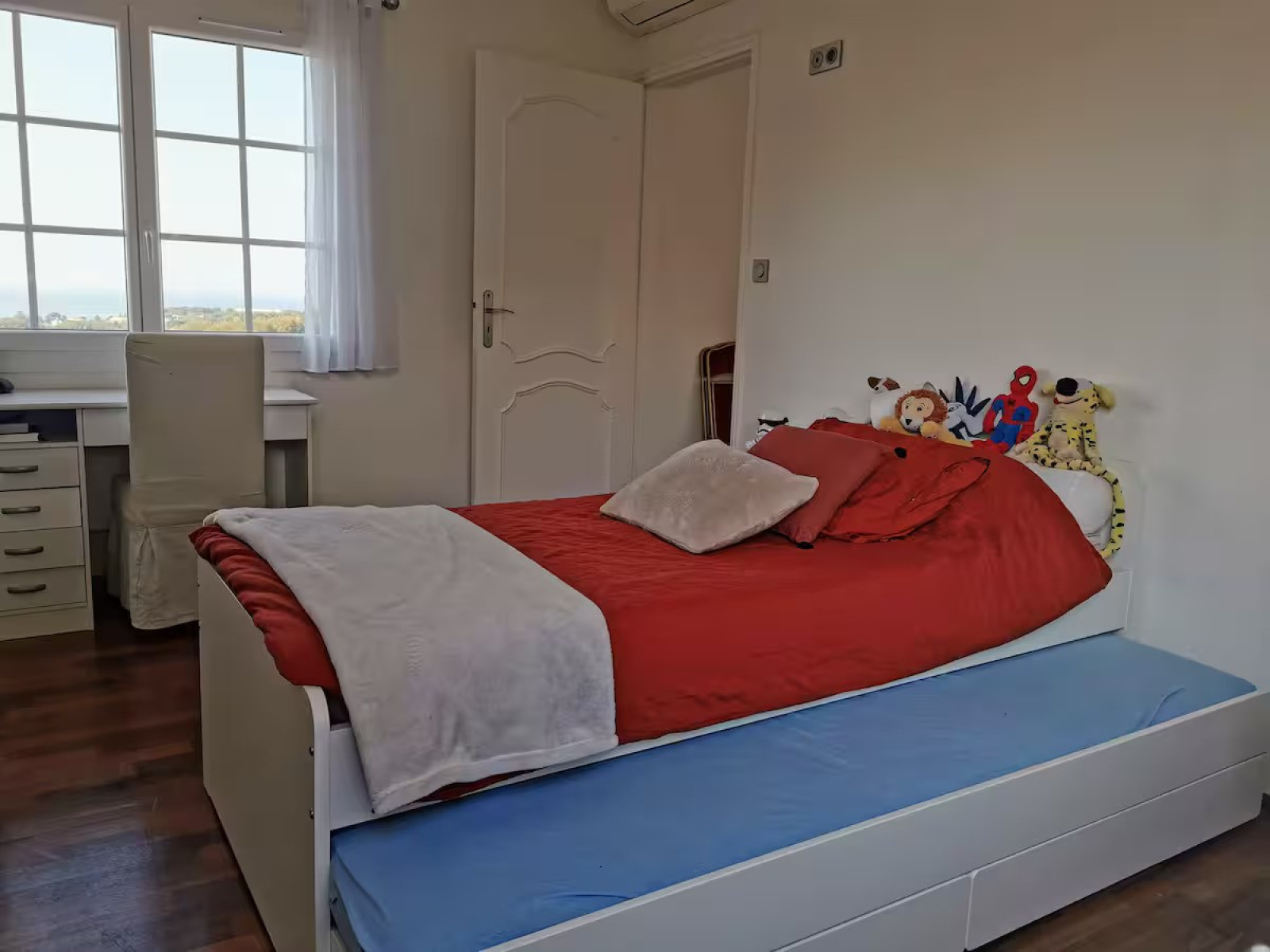 Au rez-de-chaussée, un vaste hall d’entrée avec rangements intégrés dessert harmonieusement les espaces. Le séjour et la cuisine ouverte offrent un cadre de vie convivial et lumineux. Une première chambre profite d’un agréable aperçu mer — un privilège discret et raffiné — tandis qu’une seconde chambre, une buanderie et une salle d’eau complètent ce niveau.